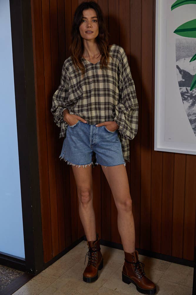 Woven Gauze V-Neck Long Sleeve Loose Fit Top Raw Frey Edges